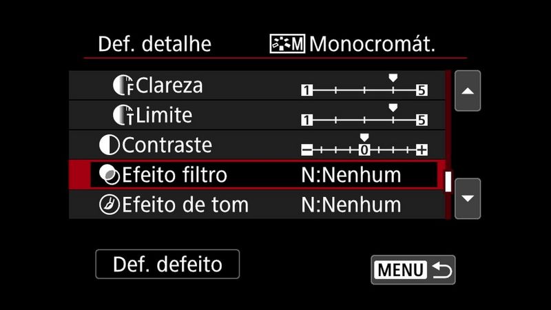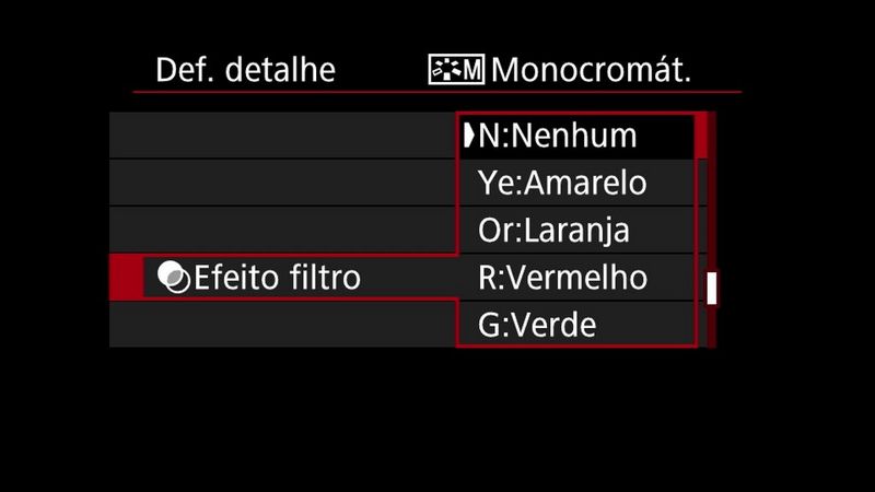 Para câmaras com modo Criativo auto (CA), pode escolher a opção de Ambiente monocromático. Para maior controlo sobre o aspeto das suas imagens, selecione um dos modos Zona criativa: Programa (P), Prioridade à abertura (Av), Prioridade ao obturador (Tv), Manual (M) ou "Bulb" (B) e escolha Monocromático no menu Estilo imagem. Pode aceder ao menu Estilo imagem através do menu principal da câmara ou fazer alterações no ecrã Controlo rápido.