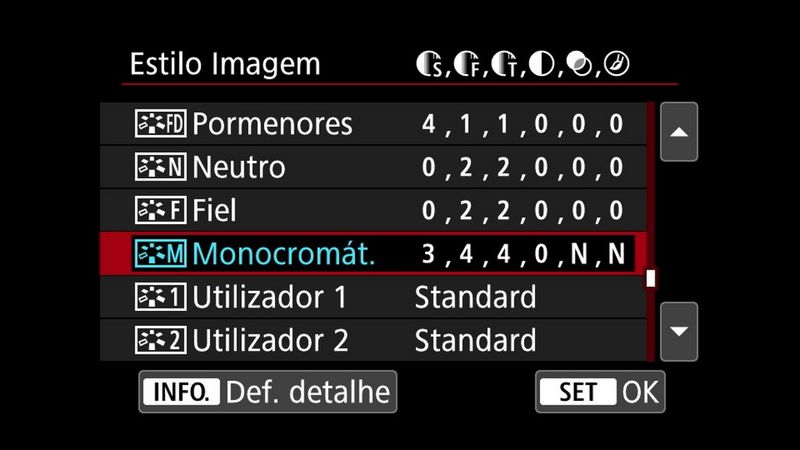 Tal como com as outras opções de Estilo imagem, pode personalizar a definição Monocromático para obter vários aspetos diferentes. Para isso, selecione-a no menu Estilo imagem e prima o botão INFO.
